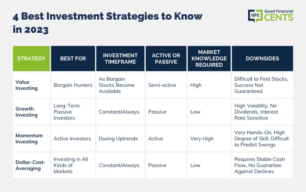 - Downsides: Just as it’s important for investors to know the basic styles of each investment strategy, they must also know any potential negatives. There are two or three associated with each strategy, and you must be comfortable with those outcomes.