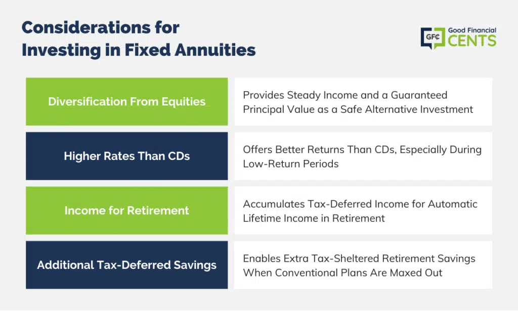 If you’re looking for a safe alternative investment for part of your portfolio, fixed annuities can be a solid diversification. They provide a fixed rate of return, steady income, and a guaranteed principal value.